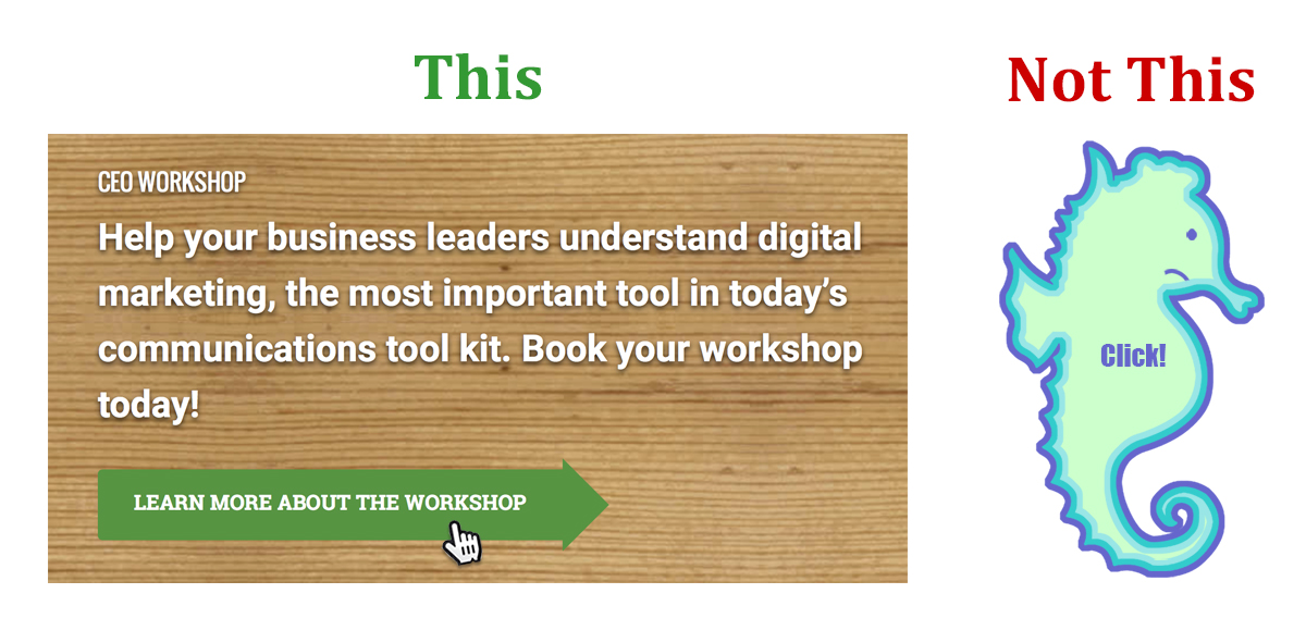 - Look like buttons: This may seem like a no brainer, but you’d be surprised at the number of seahorse-shaped buttons swimming through the interwebs. Your users don’t want to spend time figuring out if it is a real button or some fancy decoration; they just want to click. So make it easy. Buttons should look clickable. They should be rectangular (ish) or circular (ish) like a real elevator button, or a “Launch Rocket Now” button.